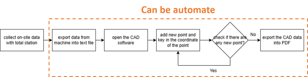 Here let me demonstrate an example, imagine you are a land surveyor, your daily job is to go to the site and use the total station to collect the on-site data, bring it back to the office, and draw it into the site drawing software, finally you need to export the drawing into PDF for submission. Your workflow may be like this.