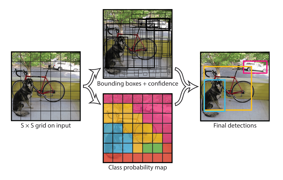 The methodologies of the YOLO are divided into 4 steps: grid-based input segmentation, bounding boxes and confidence prediction, conditional class probability map prediction, and non-max suppression (NMS) bounding boxes integration.